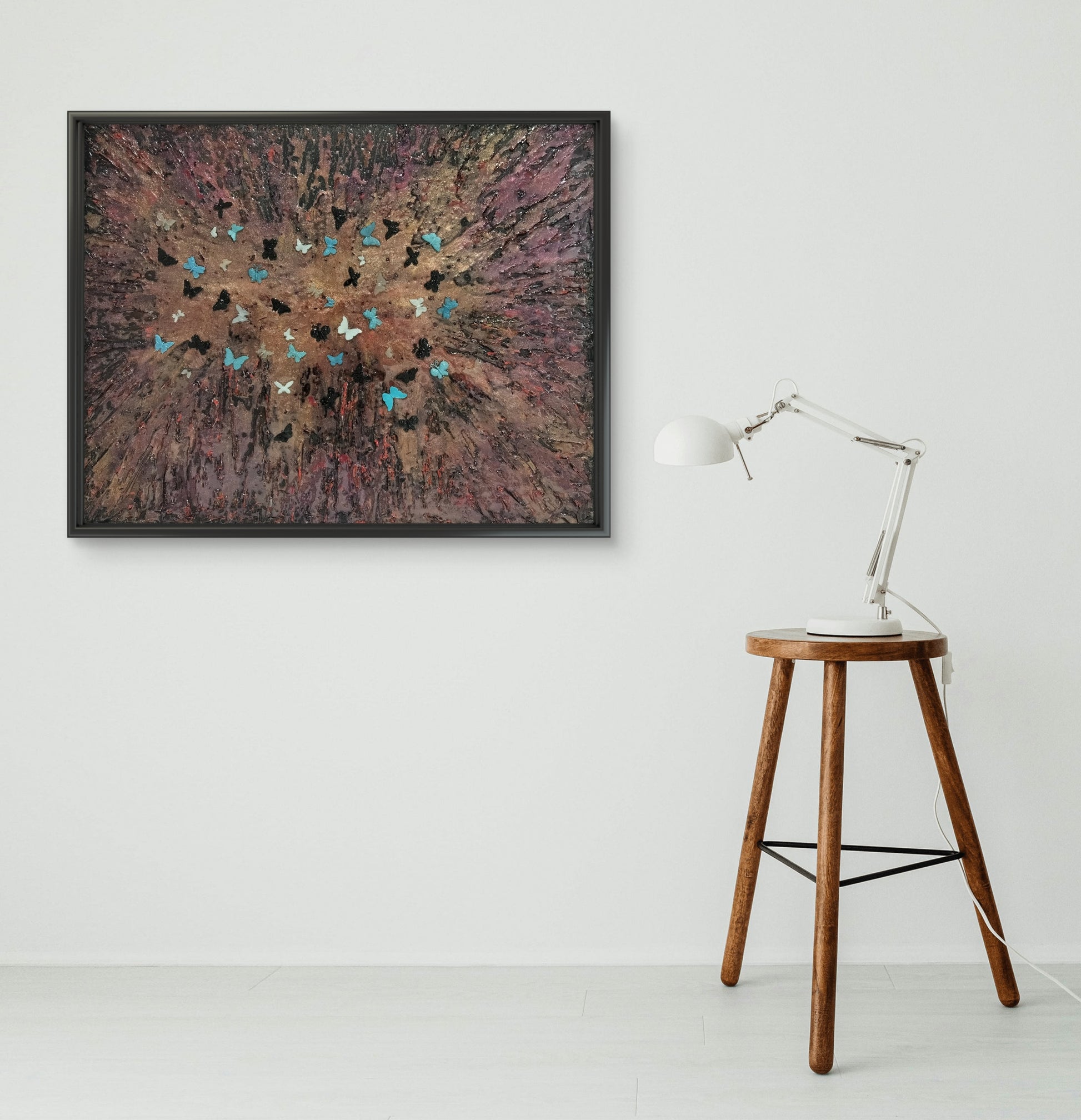 La base in legno è trattata con prodotti specifici per adattarsi all'utilizzo della resina. Osservando l'opera da diverse angolazioni è possibile notare un cambiamento nel suo effetto cromatico dovuto all'utilizzo della resina.