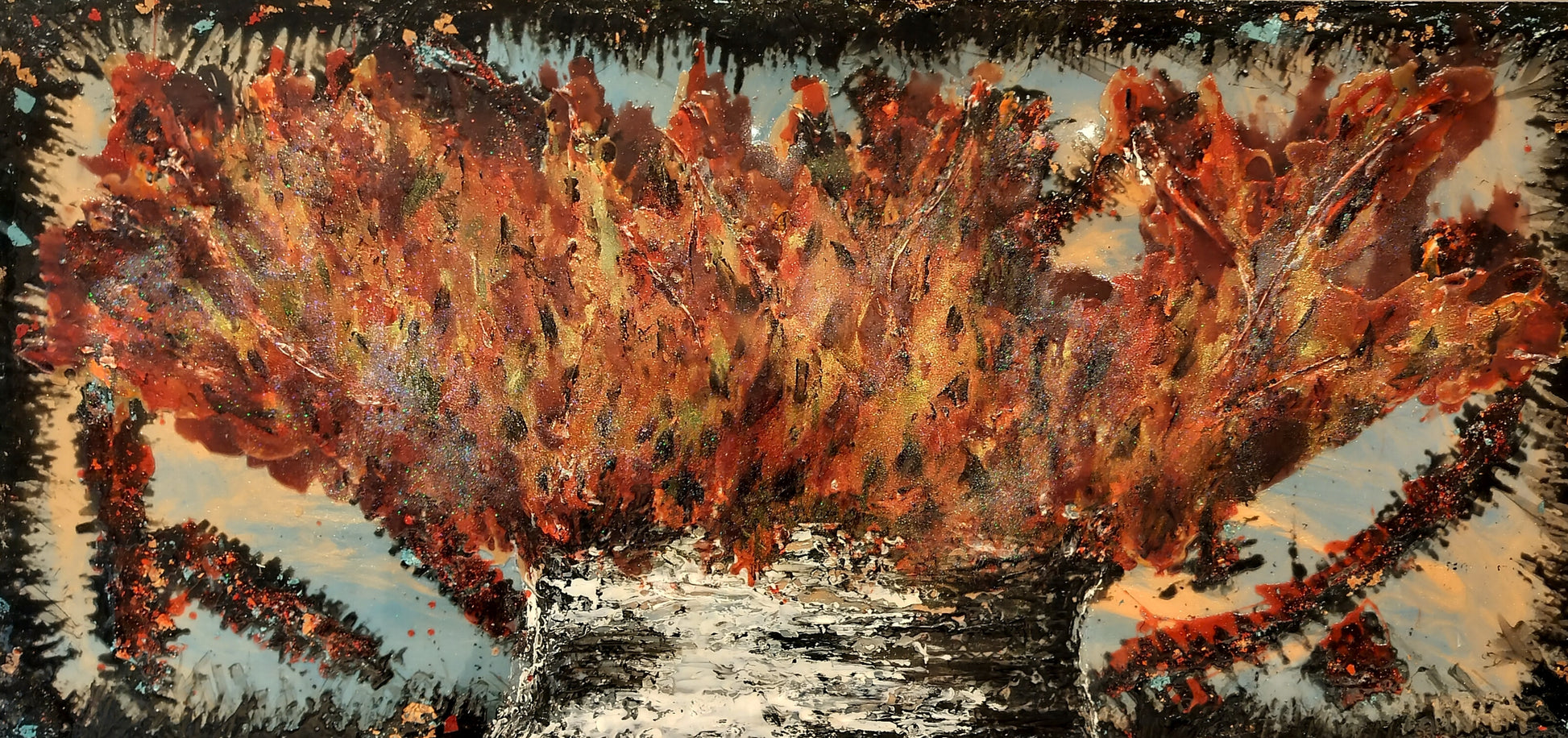The wooden panel base is treated with specific products to make it suitable for the use of resin. When observing the piece from different angles, its chromatic effect shifts due to the properties of the resin.