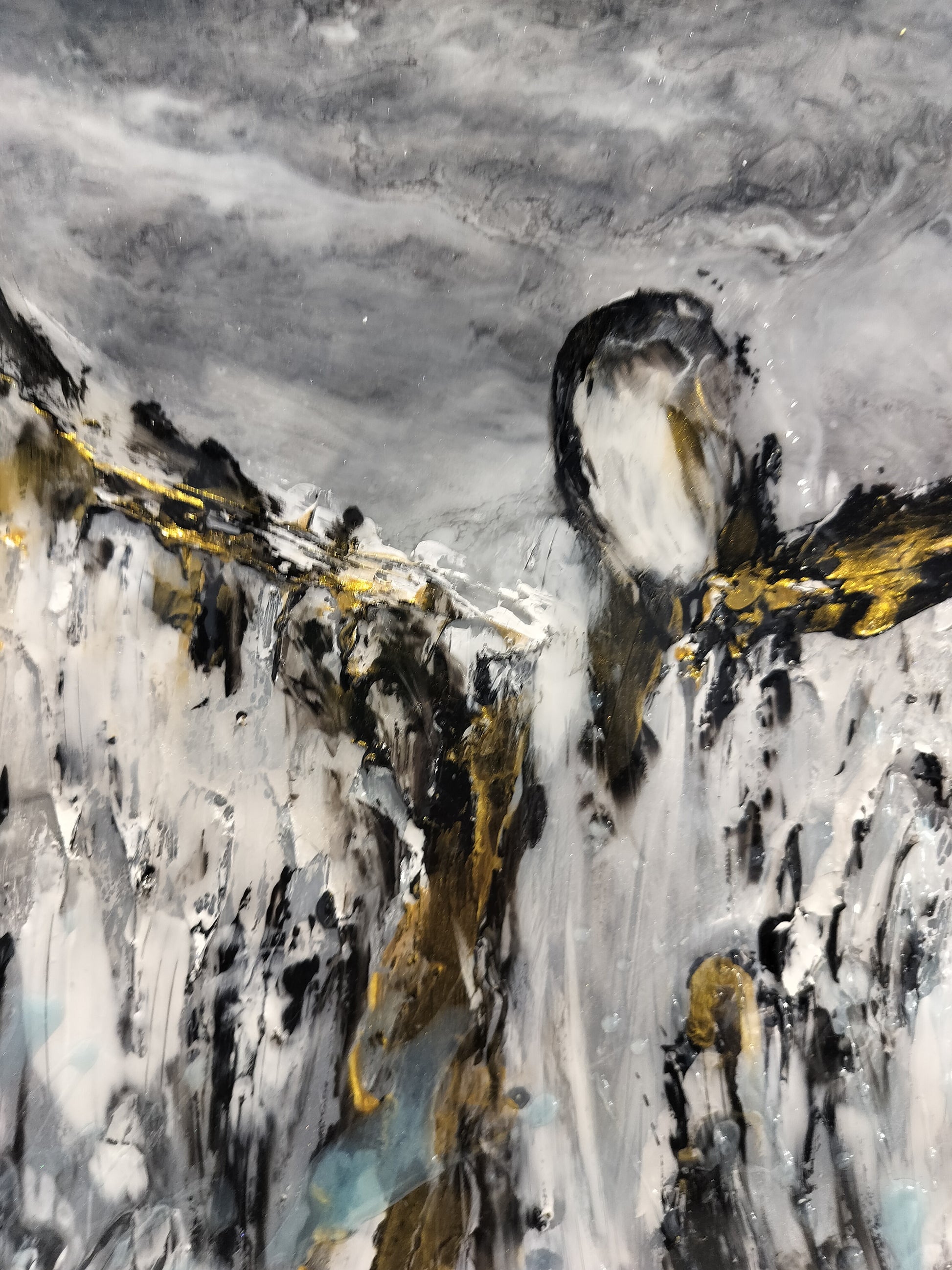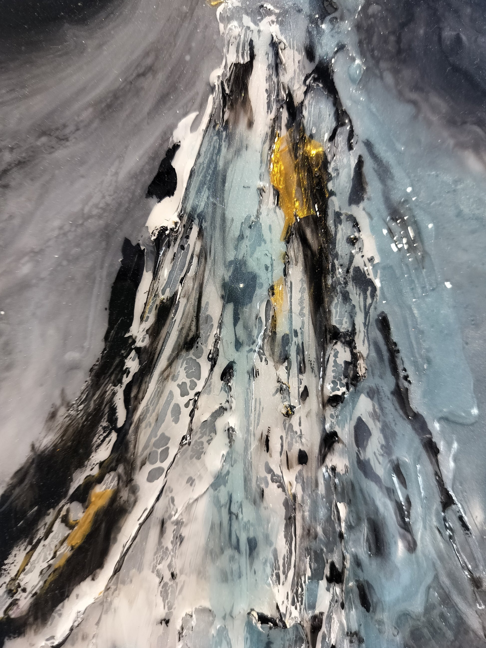 La base in legno è trattata con prodotti specifici per adattarsi all'utilizzo dei colori acrilici e della resina. Osservando l'opera da diverse angolazioni è possibile notare un cambiamento nel suo effetto cromatico dovuto all'utilizzo della resina.