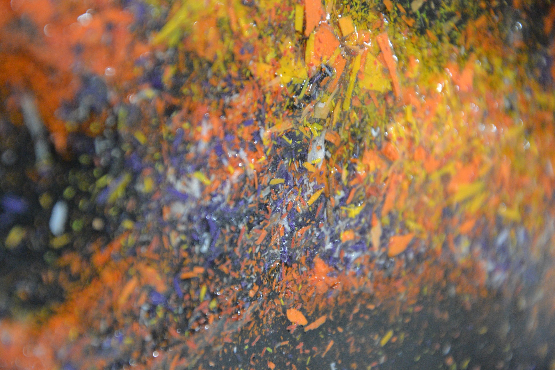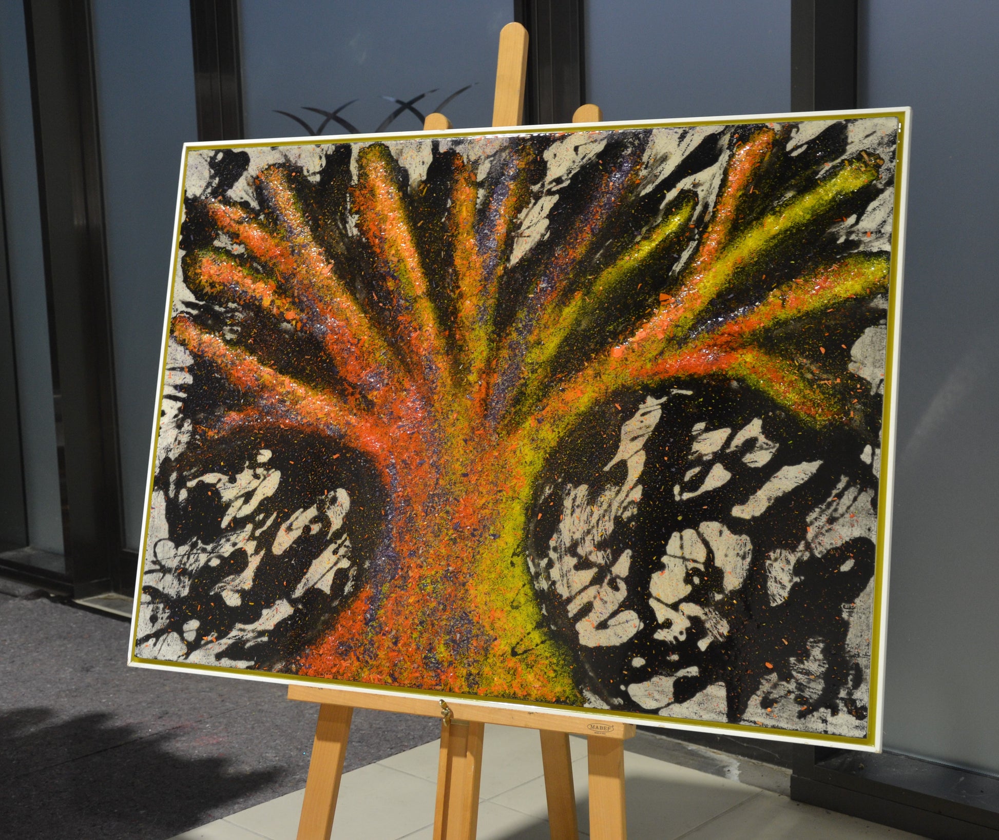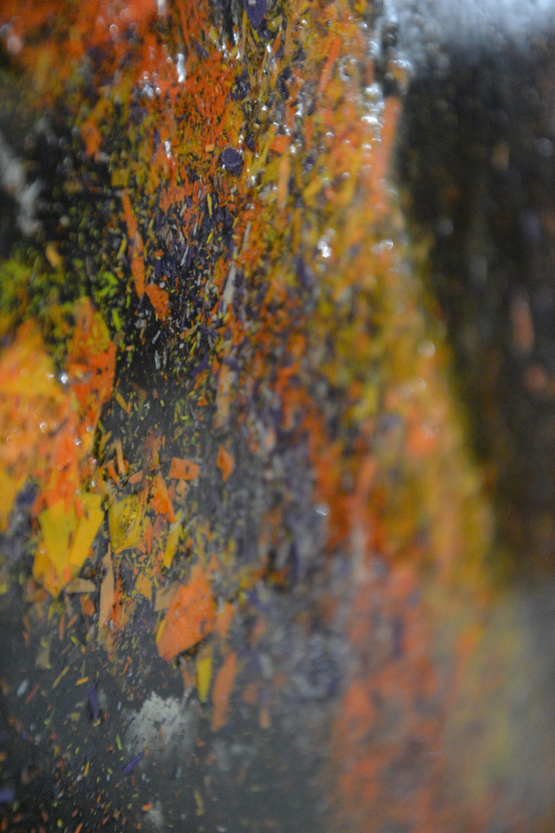 L'opera è realizzata miscelando resina epossidica, trucioli di cera e colori acrilici.
