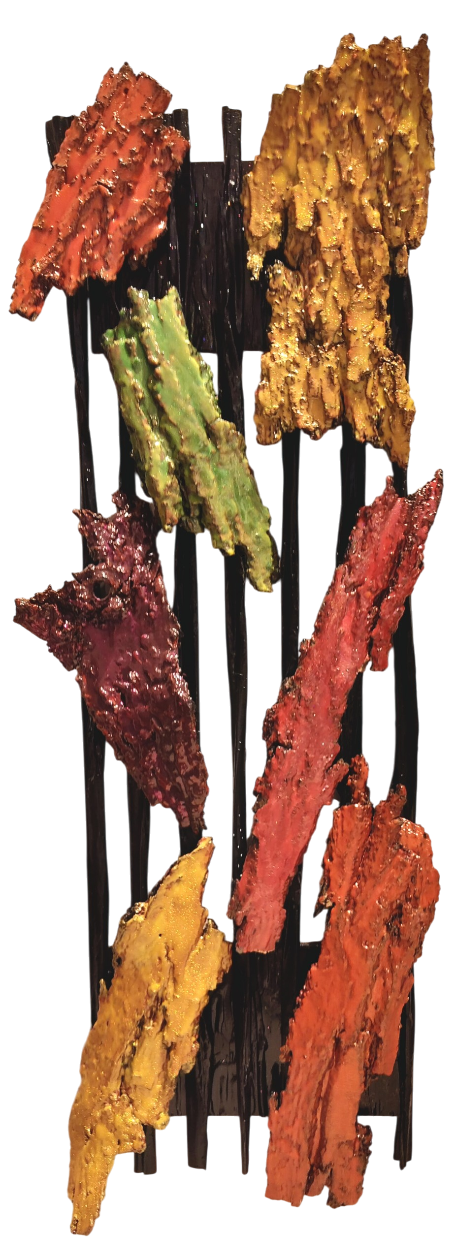 The base is treated with specific products to make it suitable for the use of resin. When observing the piece from different angles, its chromatic effect shifts due to the properties of the resin.