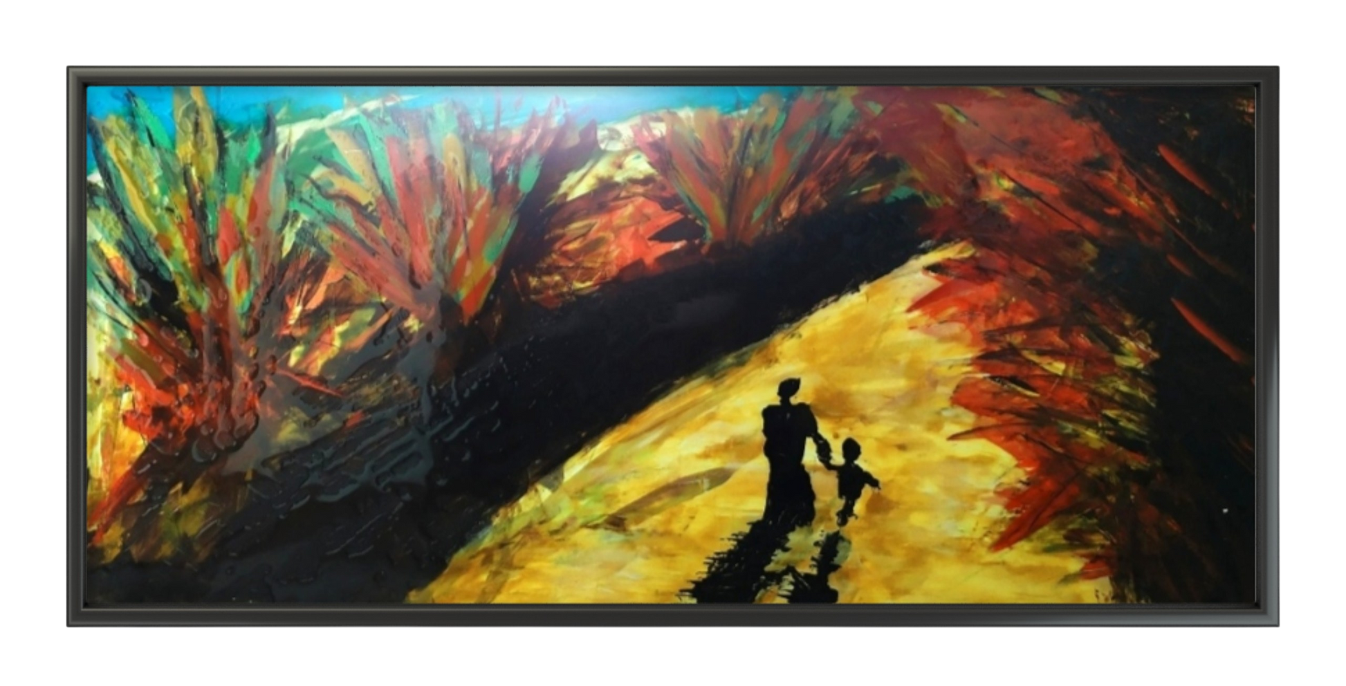The wooden panel base is treated with specific products to make it suitable for the use of resin. When observing the piece from different angles, its chromatic effect shifts due to the properties of the resin.